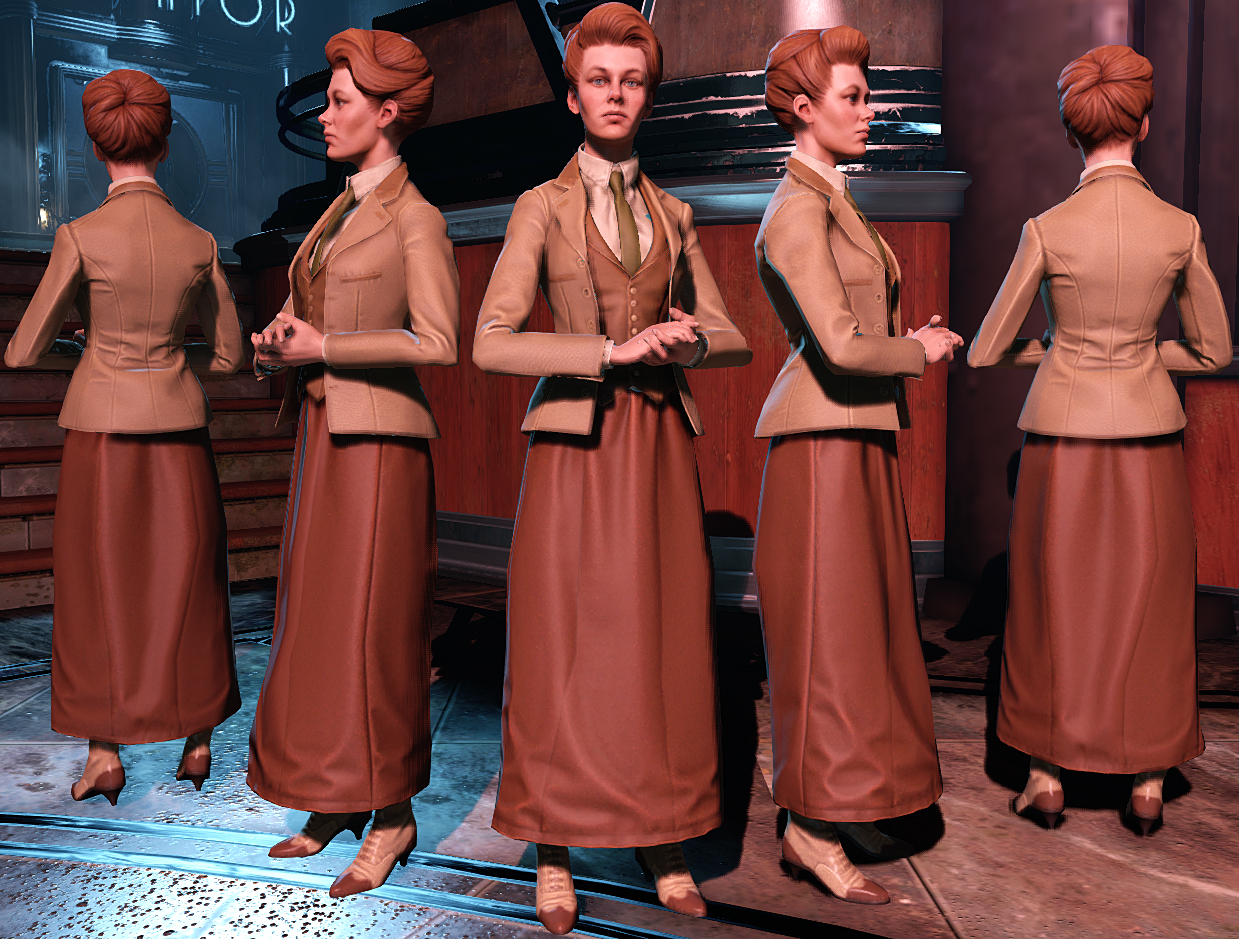 Her first outfit consists of a blouse, tie, skirt, button up shoes, and a cameo necklace selected by the player(though the bird one seems to be the default). The shirt seems to be an attempt at a shirtwaist, however it follows the line of the bust. True, by 1912, women's fashion was starting to move away from the dramatic pigeon breast look, but her blouse has a modern day fit. The 3/4 length sleeves did exist but-from what I can tell-were not common. I was able to find an image of a shirtwaist similar to Elizabeth's. Despite this, the most well known image of the shirtwaist has a high neck and long sleeves, with a loose front. You can also see little lines on either side, which seem to represent pleating, which was commonly found on shirtwaists. The thing that irks me the most about the blouse is that it's so close to good, but so far away. The necklace is described by official sources as a cameo, but the official reproductions by irrational seem to be made of metal set into black resin. Traditional cameo jewelry was carved out of multi coloured stone or shells, with the top layers being carved away to create a design.